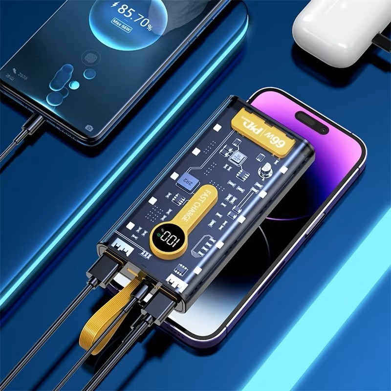 Experience cutting-edge performance and sleek style with the 20000mAh Transparent Fast Charging Power Bank — your ultimate portable charging solution for all devices.